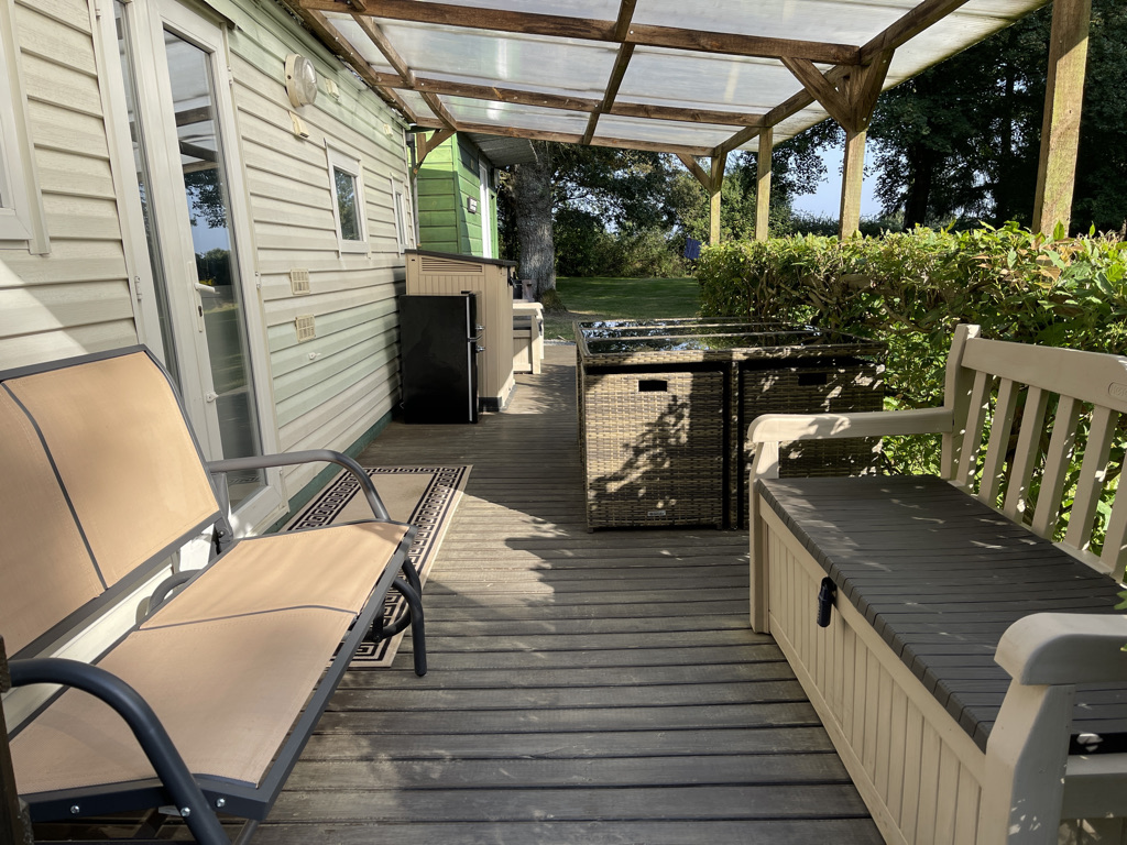 You can hire the very comfortable 2 bedroom Lodge that sleeps 4, you will find a living room and fully fitted kitchen area, sofa, english TV, fridge, cooking utensils and bed linen, along with a lovely outside undercover terrace and dining area offering views across the lake.